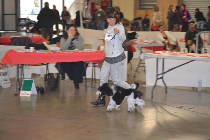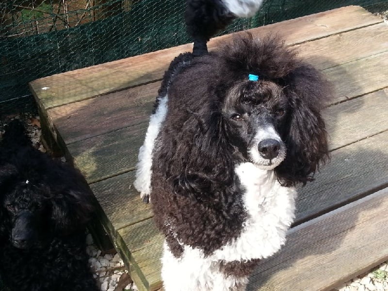 Magnifique CPPF (chien particolore à poils frisés) autrement appelé de partout dans le monde caniche particolore. Caractére du caniche, comportement du caniche, fourrurre frisée de caniche, morphologie de caniche, standard de caniche sauf pour la couleur.